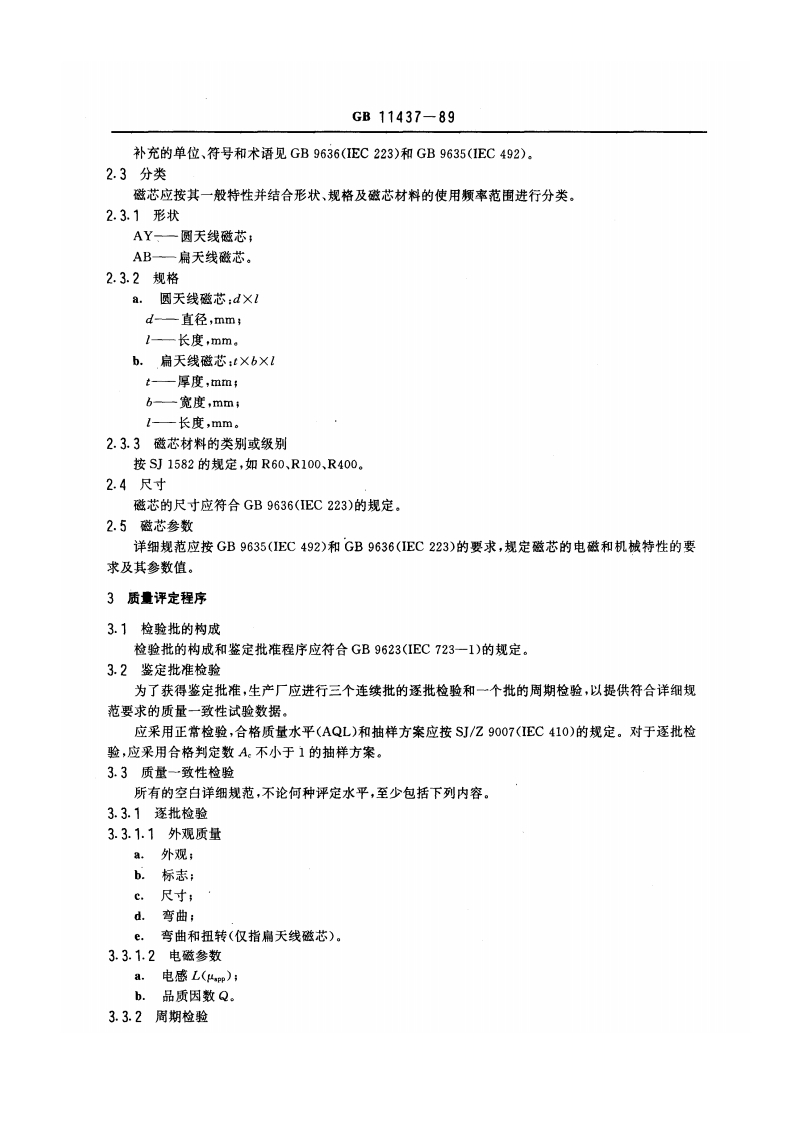 中华人民共和国国家标准广播接收机天线用铁氧体磁芯分规范GB11437-89Ferrite cores used in broadcastreceiver aerialsSectional specification(可供认证用)1范围本规范规定了广播接收机天线用铁氧体磁芯(以下简称“磁芯”)的质量评定程序和质量一致性检验要求。本规范适用于具有圆形或矩形截面的磁芯。本规范从总规范GB9623(EC723一1)《通信用电感器和变压器磁芯第一部分:总规范》和基础标准GB9635(IEC492)《天线棒的测量方法》、GB9636(IEC223)《磁性氧化物圆天线棒和扁天线棒的尺寸》,SJ/Z9001.1(IEC68一1)等中选取了适合于详细规范使用的试验方法。详细规范应按本规范编制并应符合相应空白详细规范的规定。有关测量方法应遵循的测量条件,测量设备和监测措施应在详细规范中规定。2总则2.1有关标准GB9623(IEC723一1)通信用电感器和变压器磁芯第一部分:总规范GB11439(IEC367一2)通信用电感器和变压器磁芯第二部分:起草性能规范的导则GB9636(IEC223)磁性氧化物圆天线棒和扁天线棒的尺寸GB9635(1EC492)天线棒的测量方法GB9634(IEC424)磁性氧化物制成的元件外形缺陷极限规范的指南SJ/Z9007(IEC410)计数检查抽样方案和程序SJ/Z9006(IEC419)电子元器件(或部件)规范中逐批检查与周期检查指南SJ/Z9001.1(IEC68一1)基本环境试验规程第一部分:总则SJ/Z9001.2(IEC68一2-1)第二部分:各种试验试验A:低温SJ/Z9001.3(IEC68-2-2)试验B:干热SJ/Z9001.5(IEC68-2一5)试验Ca:稳态湿热SJ/Z9001.4(IEC68-2一14)试验N:温度变化SJ/Z9001.7(IEC68一2一13)试验M:低气压S)1582铁氧体磁性材料牌号与零件型号命名方法2.2单位、符号和术语单位、图形符号、文字符号和术语应按GB9623(1EC723一1)的规定。中华人民共和国机械电子工业部1989-03-20批准1990-03-01实施