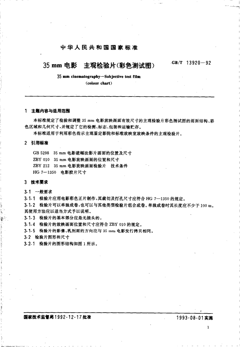 UDC.771.531.35N44中华人民共和国国家标准GB/T13920-9235mm电影主观检验片(彩色测试图)35 mm cinematography-Subjective test film(colour chart)1992-12-17发布1993-08-01实施国家技术监督局发布