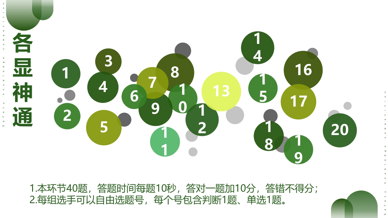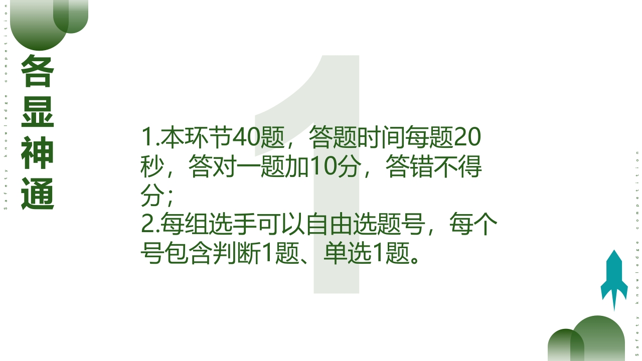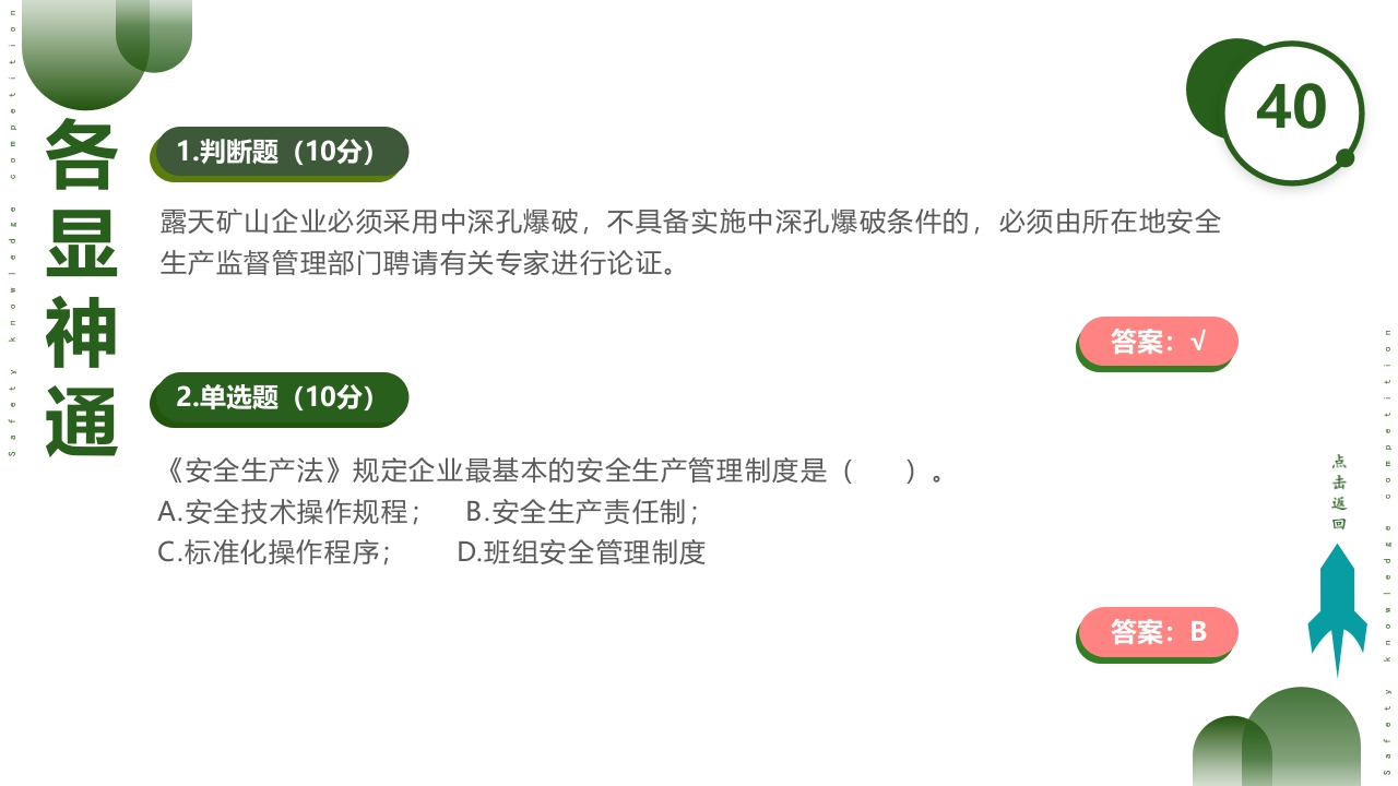 安全生产月WORK SAFETY MONTH2025安全生产月安全知识竞赛人人讲安全个个会应急2025606备注:此知识竞赛PPT为【非煤矿山】行业通用模板,适用于绝大多数露天、地下非煤矿山可结合自身特点,适当调整部分题型附答案·附解析·附动画带倒计时适用于竞赛小组数量:5个或10个下载后①修改公司名称、日期;②删除该段即可使用