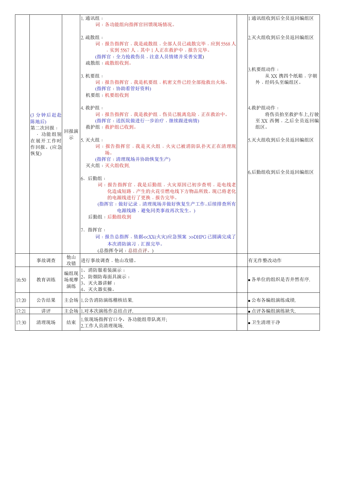 消防演习流程主题:XX消防疏散逃生应急演习演习方式演习时间:地点:参加单内容:时间状况演示演习状况/步骤DRI考核标准科目13:30场地布置1、演习集合场地布置)场地布置恰当合理2、火场设置准备等,依据图示各项工作准备充分1消防编组人员准时集合在疏散集合地点:1)各编组佩戴对应袖标;2)公安组带雪花简(3个1人)和警示带;3)灭火组四人着消防服,分别携带消防铁锹一个、消防斧一个、铁剪一个和灭16:00集合动员火器一个;4)机要组四人佩戴防烟防毒面具,四个纸箱;5)救护组两人阐述消防演习的意义着消防服、单架和药箱各一个;6)后勤组持工具箱2个2、方经理动员1、编组人员返回各自工作岗位(前期准备工作完成后向指挥官报告):疏散组:各楼梯间24F指派产线干部进行对疏散人员安全倡导与指引指挥官通信可留在现场16:25人员就位公安组:对外围进行警戒,并对疏散出的人员进行安全地点指引救护组:扮伤员者在X待命查看人员是否回岗作业其他五组:在X附近待命XX:在预定位置听信号启动警铃16:30(1分钟后)点烟雾弹(听指令作业)演习状况一:员工报警是否正确:响警铃(听指令作业)开始。详细地址X栋X楼报警演1.员工报警;的■起火物.东侧仓库,因线2.报警词:报告通讯组,我是XXXX栋X楼东侧仓库发生大火,而且火灾有路短路发生大■火势情况蔓延趋势,请求救援,我的电话是XX火(假设)报警人姓名及电话号码(通讯组:通迅组收到。)通讯组向指挥官报告;报告词:报告指挥官:我是通讯组,X栋XX楼东侧仓库发生大火,而接到火警后立即报告指挥官:且火灾有蔓延趋势,请求指示!2指挥官命令通信组(电话):立即停止生产、启动消防编组;(从办公室出来边走边打电话)令词:我命令立即停止生产、迅速启动消防预案,各就各位,展开救(1分钟后)指挥官援工作。指挥官判断、指挥演练(通讯组:通迅组收到。)指挥官的调度是否按轻重,信息3、指挥官向总指挥(韩协理)报告:是否畅通;报告词:报告总指挥,我是X,X栋X楼东侧仓库,发生大火,现正组织抢救,现场最新状况随时向你报告。◇总指挥向指挥官下达命令:总指挥令词:调集人力、物力抢救,确保人员安全,随时回馈情况(指挥官:指挥官收到1、通信组将指令通报各消防功能编组:(对讲机)信息接收、传达是否快速准确:通报词:各功能小组请注意,现XX栋X楼东侧仓库,发生大火,指挥·迅速且尽可能的靠近火灾区域通信组官指示:灭火组组织灭火,疏散组进行疏散,其他小组奔赴观察火灾发展趋势作响应;通报演火场展开救援工作,并及时报告。通讯组在向各功能组通报的同时(1分钟后)练公安组:公安组收到。灭火组:灭火组收到。疏散组:疏散组收到。周边单位:机要组:机要组收到。后勤组:后勤组收到。救护组:救护组收到:指挥官同时向总指挥报告;功能组应急响(实况时各小组依据火情可自行履行职责)此时灭火组和机要组出发救援应动作(XX栋)1.通信组:通知各功能组向指挥官靠拢;(实战动作)功能组2灭火组:从XXX出警经码头至XX(实点至着火点)别演练3.疏散组:已按职责到达指定岗位并开始指导与倡导工作(同时作机要组:出警经码头至X(实点至着火点)功能组有无慌乱且听指挥行动:业)5.后勤组:出警经码头至X(实点至着火点)灭火组、疏散组、机要组、后勤6.公安组:已按职责警戒到位并开始指导疏散与倡导工作组、救护组、公安组信息接收、1.通信组:通知各动能组向指挥官靠拢。(现场指挥所X)传递是否快速准确2.灭火组:集合地穿戴消防服等,立即赴火场展开工作,并回报疏散救护人员是否定岗定位(参功能组3.疏散组:迅速赴岗位展开疏散工作并回报照消防演习疏散图)功能组别别演练4.机要组:赴岗展开抢救文件、仪器工作并回报疏散组人员是否屡行职责动作步骤(同时作5.后勤组:停电、送水、准备灭火物质等灭火组后勤组人员是否定岗定位业)6.救护组:拿起急救器具向指挥官靠拢(现场指挥所)7.公安组:至重要路口、集合地、接消防车等8.信息中心:通知总指挥、相邻单位(报告词略)