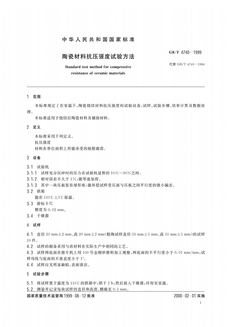 GB/T4740-1999前言本标准是按GB/T1.1一1993《标准化工作导则第1单元:标准的起草与表述规则第1部分:标准编写的基本规定》对GB/T4740一1984进行修订本标准与GB/T4740一1984的主要技术差异如下:标准的结构、技术要素及表述规则按GB/T1.1一1993进行了修改。根据科学,适用要求,对试验机的条件进行了规定,并加入了试样的干燥部分。本标准自实施之日起同时代替GB/T4740一1984。本标准由国家轻工业局提出。本标准由全国陶瓷标准化中心技术归口。本标准负责起草单位:中国轻工总会陶瓷研究所。本标准主要起草人:张侃、徐莉华、程塑贤。GB/T4740-1999前言本标准是按GB/T1.1一1993《标准化工作导则第1单元:标准的起草与表述规则第1部分:标准编写的基本规定》对GB/T4740一1984进行修订本标准与GB/T4740一1984的主要技术差异如下:标准的结构、技术要素及表述规则按GB/T1.1一1993进行了修改。根据科学,适用要求,对试验机的条件进行了规定,并加入了试样的干燥部分。本标准自实施之日起同时代替GB/T4740一1984。本标准由国家轻工业局提出。本标准由全国陶瓷标准化中心技术归口。本标准负责起草单位:中国轻工总会陶瓷研究所。本标准主要起草人:张侃、徐莉华、程塑贤。