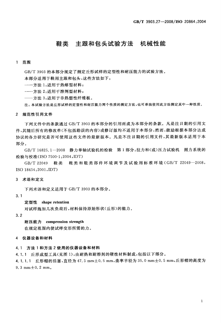 GB/T3903.27-2008/IS020864:2004前言GB/T3903的本部分等同采用国际标准IS020864:2004《鞋类主跟和包头试验方法机械性能》(英文版)。为便于使用,本部分做了下列编辑性修改:a)别除国际标准的前言;b)删除国际标准的目录;c)用小数点“.”代替作为小数点的逗号“,”;d)对于IS020864:2004中所引用的国际标准,本部分直接引用与之相对应的国家标准;e)删除国际标准的附录.本部分由中国轻工业联合会提出。本部分由全国制鞋标准化技术委员会归口。本部分起草单位:中国皮革和制鞋工业研究院,青岛享达集团有限公司。本部分主要起草人:间宏伟、李桂芬、张伟娟、王吉万、单玉萍。GB/T3903.27-2008/IS020864:2004前言GB/T3903的本部分等同采用国际标准IS020864:2004《鞋类主跟和包头试验方法机械性能》(英文版)。为便于使用,本部分做了下列编辑性修改:a)别除国际标准的前言;b)删除国际标准的目录;c)用小数点“.”代替作为小数点的逗号“,”;d)对于IS020864:2004中所引用的国际标准,本部分直接引用与之相对应的国家标准;e)删除国际标准的附录.本部分由中国轻工业联合会提出。本部分由全国制鞋标准化技术委员会归口。本部分起草单位:中国皮革和制鞋工业研究院,青岛享达集团有限公司。本部分主要起草人:间宏伟、李桂芬、张伟娟、王吉万、单玉萍。