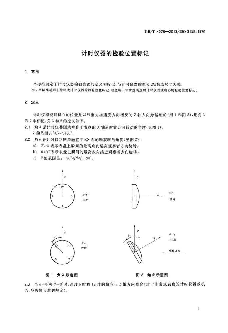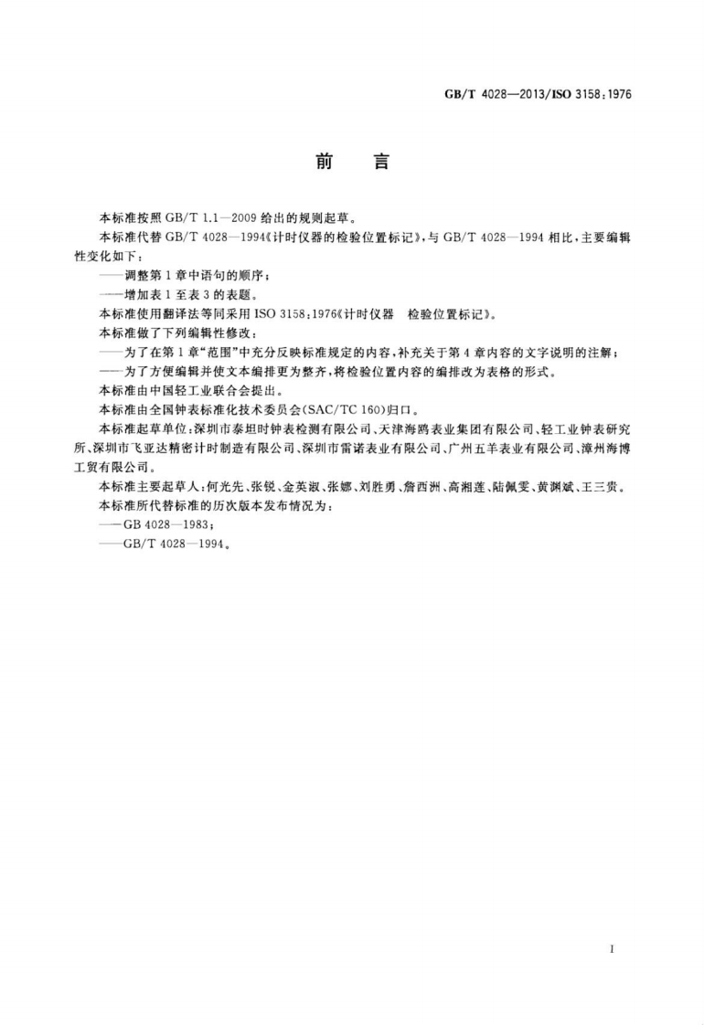 GB/T4028-2013/1S03158:1976前言本标准按照GB/T1.1一2009给出的规则起草。本标准代替GB/T4028一1994《计时仪器的检验位置标记》,与GB/T4028一1994相比,主要编辑性变化如下:—调整第1章中语句的顺序;一增加表1至表3的表题。本标准使用翻译法等同采用1S03158:1976《计时仪器检验位置标记》.本标准做了下列编辑性修改:一为了在第1章“范围”中充分反映标准规定的内容,补充关于第4章内容的文字说明的注解:为了方便编辑并使文本编排更为整齐,将检验位置内容的编排改为表格的形式。本标准由中国轻工业联合会提出。本标准由全国钟表标准化技术委员会(SAC/TC160)归口。本标准起草单位:深圳市泰坦时钟表检测有限公司,天津海鹨表业集团有限公司,轻工业钟表研究所、深圳市飞亚达精密计时制造有限公司、深圳市雷诺表业有限公司、广州五羊表业有限公司、漳州海博工贸有限公司本标准主要起草人:何光先张锐、金英淑、张娜、刘胜勇、詹西洲、高湘莲、陆佩雯、黄渊斌、王三贵。本标准所代替标准的历次版本发布情况为:-GB4028-1983:—GB/T4028-1994.GB/T4028-2013/1S03158:1976前言本标准按照GB/T1.1一2009给出的规则起草。本标准代替GB/T4028一1994《计时仪器的检验位置标记》,与GB/T4028一1994相比,主要编辑性变化如下:—调整第1章中语句的顺序;一增加表1至表3的表题。本标准使用翻译法等同采用1S03158:1976《计时仪器检验位置标记》.本标准做了下列编辑性修改:一为了在第1章“范围”中充分反映标准规定的内容,补充关于第4章内容的文字说明的注解:为了方便编辑并使文本编排更为整齐,将检验位置内容的编排改为表格的形式。本标准由中国轻工业联合会提出。本标准由全国钟表标准化技术委员会(SAC/TC160)归口。本标准起草单位:深圳市泰坦时钟表检测有限公司,天津海鹨表业集团有限公司,轻工业钟表研究所、深圳市飞亚达精密计时制造有限公司、深圳市雷诺表业有限公司、广州五羊表业有限公司、漳州海博工贸有限公司本标准主要起草人:何光先张锐、金英淑、张娜、刘胜勇、詹西洲、高湘莲、陆佩雯、黄渊斌、王三贵。本标准所代替标准的历次版本发布情况为:-GB4028-1983:—GB/T4028-1994.