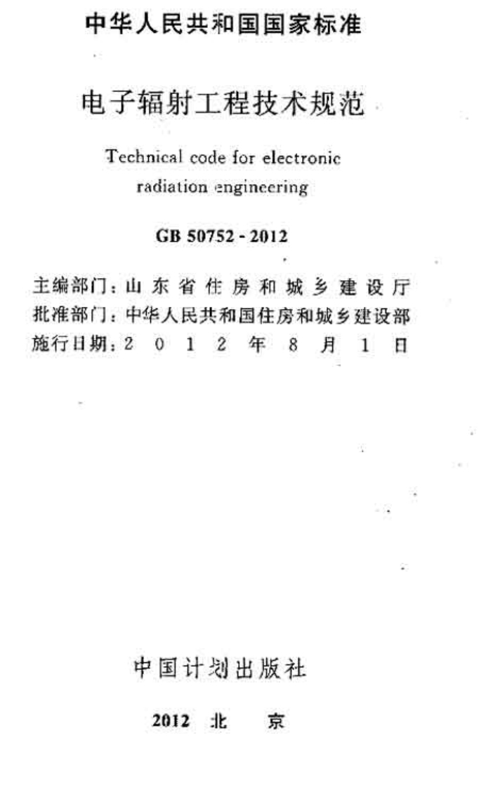 UDC中华人民共和国国家标准PGB50752-2012电子辐射工程技术规范Technical code for electronicradiation engineering2012-01-21发布2012-08-01实施中华人民共和国住房和城乡建设部联合发布中华人民共和国国家质量监督检验检疫总局