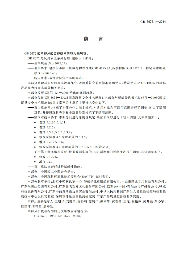 GB6675.1-2014前言GB6675的本部分的全部技术内容为强制性。GB6675是玩具安全系列标准,包括以下部分:—基本规范(GB6675.1);一通用要求,包括但不限于机械与物理性能(GB6675.2)、易燃性能(GB6675.3)、特定元素的迁移(GB6675.4):一特定要求,是针对特定产品的要求。本部分是玩具安全的基本规范部分,适用并符合系列标准通用要求、特定要求及GB19865的玩具产品视为符合本部分相关要求。本部分按照GB/T1.1一2009给出的规则起草。本部分代替GB6675一2003《国家玩具安全技术规范》,本部分与所部分代替GB6675一2003《国家玩具安全技术规范》的第3章至第8章的主要技术变化如下:一第1章范围,体现了本部分作为基本规范,对适用对象和不适用范围进行了调整:扩大了适用对象,并按照玩具类别和非玩具类别规范了不适用范围。一第5章技术要求,本部分只进行原则性规定,条款和内容进行了较大调整,具体调整如下:。增加5.1.10、5.1.11:·增加5.2.3:·增加5.3.1、5.3.2、5.3.7·修改原标准4.3为现部分的5.3.3:·增加5.4、5.5、5.6:·修改原标准4.4为现部分的5.7.1、5.7.2和附录A。一关于第6章实施与监督,根据我国实施的CCC制度和召回制度进行了调整,具体调整如下:·修改6.4、6.6:·增加6.5。一第7章法律责任进行编辑性修改。本部分由中国轻工业联合会提出。本部分由全国玩具标准化技术委员会(SAC/TC253)归口。本部分起草单位:北京中轻联认证中心、好孩子儿童用品有限公司、中山市隆成日用制品有限公司、广东乐美达集团有限公司、广东奥飞动漫文化股份有限公司、巴斯夫(中国)有限公司广州分公司、骅威科技股份有限公司、广东小白龙动漫玩具实业有限公司、中华人民共和国广东出人境检验检疫局检验检疫技术中心玩具实验室、深圳市计量质量检测研究院、广东产品质量监督检验研究院。本部分主要起草人:王旭华、刘唐书、雷再明、陈钊仁、颜刚华、黄理纳、王龙、张艳芬、黄开胜、彭心宇、桂国球、郭样彬、唐年生。本部分所代替标准的历次版本发布情况为:—GB6675一1986、GB6675-2003。