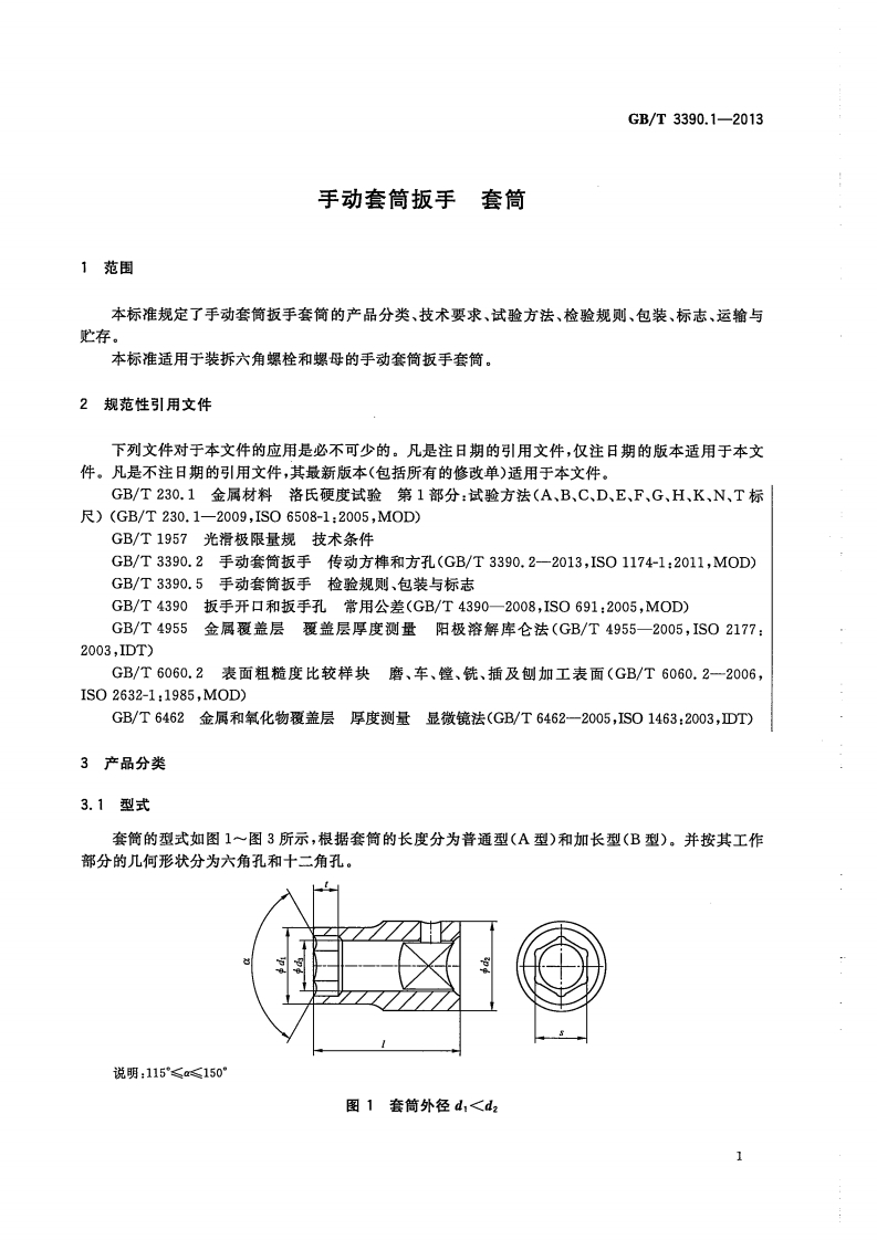 GB/T3390.1-2013手动套筒扳手套筒1范围本标准规定了手动套筒扳手套筒的产品分类、技术要求、试验方法、检验规则、包装、标志、运输与贮存。本标准适用于装拆六角螺栓和螺母的手动套筒扳手套筒。2规范性引用文件下列文件对于本文件的应用是必不可少的。凡是注日期的引用文件,仅注日期的版本适用于本文件。凡是不注日期的引用文件,其最新版本(包括所有的修改单)适用于本文件。GB/T230.1金属材料洛氏硬度试验第1部分:试验方法(A、B、C、D、E、F,G、H,K、N、T标尺)(GB/T230.1一2009,IS06508-1:2005,M0D)GB/T1957光滑极限量规技术条件GB/T3390.2手动套筒扳手传动方榫和方孔(GB/T3390.2一2013,IS01174-1:2011,M0D)GB/T3390.5手动套筒扳手检验规则、包装与标志GB/T4390扳手开口和扳手孔常用公差(GB/T4390一2008,IS0691:2005,MOD)GB/T4955金属覆盖层覆盖层厚度测量阳极溶解库仑法(GB/T4955一2005,IS02177:2003,IDT)GB/T6060.2表面粗糙度比较样块磨、车、镗、铣、插及刨加工表面(GB/T6060.2-2006,IS02632-1:1985,M0D)GB/T6462金属和氧化物覆盖层厚度测量显微镜法(GB/T6462一2005,IS01463:2003,DT)3产品分类3.1型式套简的型式如图1~图3所示,根据套筒的长度分为普通型(A型)和加长型(B型)。并按其工作部分的几何形状分为六角孔和十二角孔。说明:115°≤a≤150°图1套筒外径d1