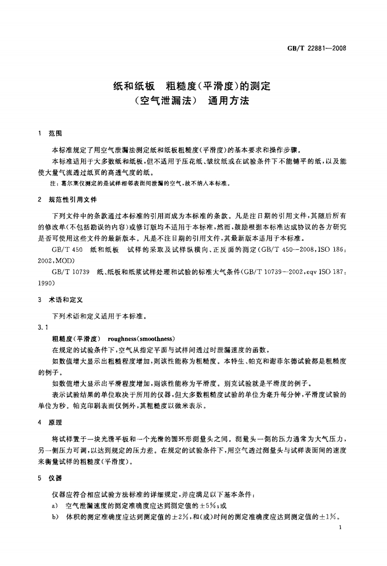 GB/T22881-2008纸和纸板粗糙度(平滑度)的测定(空气泄漏法)通用方法1范围本标准规定了用空气泄漏法测定纸和纸板粗施度(平滑度)的基本要求和操作步骤。本标准适用于大多数纸和纸板,但不适用于压花纸、皱纹纸或在试验条件下不能铺平的纸,以及能使大量气流透过纸页的高透气度的纸。注:葛尔莱仪测定的是试样相邻表面间泄漏的空气,故不纳入本标准。2规范性引用文件下列文件中的条款通过本标准的引用而成为本标准的条款。凡是注日期的引用文件,其随后所有的修改单(不包括勘误的内容)或修订版均不适用于本标准,然面,鼓励根据本标准达成协议的各方研究是否可使用这些文件的最新版本。凡是不注日期的引用文件,其最新版本适用于本标准。GB/T450纸和纸板试样的采取及试样纵横向、正反面的测定(GB/T450一2008,IS0186:2002,MOD)GB/T10739纸、纸板和纸浆试样处理和试验的标准大气条件(GB/T10739-一2002,eqv IS0187:1990)3术语和定义下列术语和定义适用于本标准。3.1粗糙度(平滑度)roughness(smoothness).在规定的试验条件下,空气从指定平面与试样间透过时泄漏速度的函数如数值增大显示出粗糙程度增加,则该性能称为粗糙度。本特生、帕克和谢菲尔德试验都是粗糙度的例子。如数值增大显示出平滑程度增加,则该性能称为平滑度。别克试验就是平滑度的例子表示试验结果的单位取决于所用的仪器,但大多数粗糙度试验的单位为毫升每分钟,平滑度试验的单位为秒。帕克印刷表面仪例外,其粗糙度以微米表示,4原理将试样置于一块光滑平板和一个光滑的圆环形测量头之间。测量头一侧的压力通常为大气压力,另一侧压力可调,以达到规定的压力差。在规定的试验条件下,用空气透过测量头与试样表面间的速度来衡量试样的粗糙度(平滑度)。5仪器仪器应符合相应试验方法标准的详细规定,并应满足以下基本条件:a)空气泄漏速度的测定准确度应达到测定值的土5%,或b)体积的测定准确度应达到测定值的士2%,和(或)时间的测定准确度应达到测定值的士1%,1