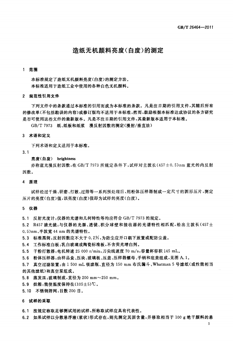 GB/T26464一2011造纸无机颜料亮度(白度)的测定1范围本标准规定了造纸无机颜料亮度(白度)的测定方法。本标准适用于造纸工业中使用的各种白色无机颜料。2规范性引用文件下列文件中的条款通过本标准的引用而成为本标准的条款。凡是注日期的引用文件,其随后所有的修改单(不包括勘误的内容)或修订版均不适用于本标准,然而,鼓励根据本标准达成协议的各方研究是否可使用这些文件的最新版本。凡是不注日期的引用文件,其最新版本适用于本标准。GB/T7973纸、纸板和纸浆漫反射因数的测定(漫射/垂直法)3术语和定义下列术语和定义适用于本标准。3.1亮度(白度)brightness亦称蓝光漫反射因数,在GB/T7973所规定条件下,试样对主波长(457土0.5)nm蓝光的内反射因数。4原理试样经过干燥,研磨、打散、过筛等一系列预处理后,用粉体压样器制成一定尺寸的圆形压片,测定压片的亮度(白度)值,该亮度(白度)值即为试样的亮度(白度)。5仪器5.1反射光度计:仪器的光谱和几何特性等均应符合GB/T7973的规定。5.2R457滤光镜:与仪器的光源、透镜、积分球壁和接收器的光谱特性相匹配,给出主波长(457士0.5)nm、半波宽44nm的光谱特性.5.3标准黑简:反射因数应不大于0.2%,为防尘应开口朝下放置或配防尘盖。5.4工作标准白板:乳白玻璃或陶瓷标准板,不含荧光增白剂。5.5干粉打散器:电机转速25000r/min,刀尖线速度70m/s,容量杯容积145mL。5.6粉体压样器:由样品盒、压块、玻璃板、压盖、压样器螺母、手柄和底盖组成,见图A.1。5.7真空过滤装置:由1500mL吸滤瓶、直径为150mm布氏漏斗、Whatman5号滤纸(或性能相当的其他滤纸)和真空泵组成。5.8蒸发皿:玻璃制成,直径为200mm~250mm5.9烘箱:能使温度保持在(105±5)℃。5.10不锈钢筛网:目数200目。6试样的采取6.1按规定称取足够测试用的试样,所称取试样应具有代表性。6.2如果试样以分散悬浮液(浆状)形式存在,则先测定其固含量,并移取相当于100g绝干颜料的悬1