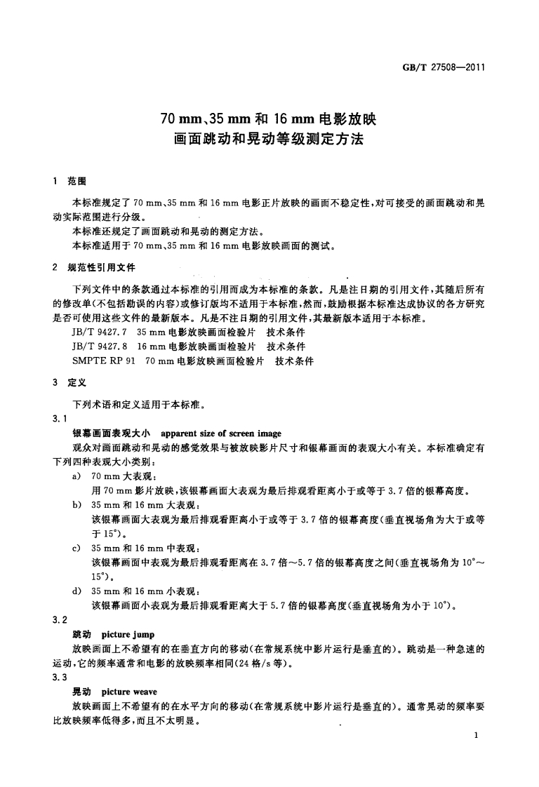 GB/T27508-201170mm、35mm和16mm电影放映画面跳动和晃动等级测定方法1范围本标准规定了70mm、35mm和16mm电影正片放映的画面不稳定性,对可接受的画面跳动和晃动实际范围进行分级。本标准还规定了画面跳动和晃动的测定方法。本标准适用于70mm、35mm和16mm电影放映画面的测试。2规范性引用文件下列文件中的条款通过本标准的引用而成为本标准的条款。凡是注日期的引用文件,其随后所有的修改单(不包括勘误的内容)或修订版均不适用于本标准,然而,鼓励根据本标准达成协议的各方研究是否可使用这些文件的最新版本。凡是不注日期的引用文件,其最新版本适用于本标准。JB/T9427.735mm电影放映画面检验片技术条件JB/T9427.816mm电影放映画面检验片技术条件SMPTE RP9170mm电影放映画面检验片技术条件3定义下列术语和定义适用于本标准。3.1银幕画面表观大小apparent size of screen image观众对画面跳动和晃动的感觉效果与被放陕影片尺寸和银幕画面的表观大小有关。本标准确定有下列四种表观大小类别:a)70mm大表观:用?0mm影片放映,该银幕画面大表观为最后排观看距离小于或等于3.7倍的银幕高度。b)35mm和16mm大表观:该银幕画面大表观为最后排观看距离小于或等于3.7倍的银幕高度(垂直视场角为大于或等于15)。c)35mm和16mm中表观:该银幕画面中表观为最后排观看距离在3.7倍一5.7倍的银幕高度之间(垂直视场角为10°~15).d)35mm和16mm小表观:该银幕画面小表观为最后排观看距离大于5.7倍的银幕高度(垂直视场角为小于10)。3.2跳动picture jump放映画面上不希望有的在垂直方向的移动(在常规系统中影片运行是垂直的)。跳动是一种急速的运动,它的频率通常和电影的放映频率相同(24格/s等)。3.3晃动picture weave放映画面上不希望有的在水平方向的移动(在常规系统中影片运行是垂直的)。通常晃动的频率要比放映频率低得多,而且不太明显。y